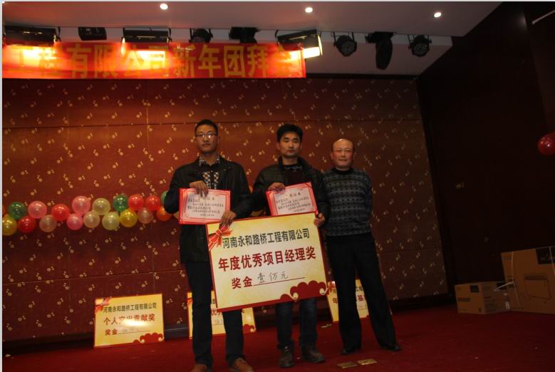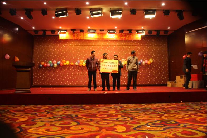 2016年2月4日晚,農(nóng)歷臘月26日晚,河南永和路橋工程有限公司在信陽市五星 級(jí)酒店中樂百花酒店隆重的舉行了2016年新春團(tuán)拜會(huì),本次團(tuán)拜會(huì)由公司全體員工及家屬、公司的合作伙伴、朋友等共同出席,大家歡聚一堂、把酒言歡、其樂融融。公司董事長孔總發(fā)表新年賀詞比代表公司對(duì)年度優(yōu) 秀個(gè)人及團(tuán)隊(duì)進(jìn)行了表彰。公司還為到場(chǎng)的每位小寶寶送上新年祝福和紅包,并準(zhǔn)備了抽獎(jiǎng)環(huán)節(jié)。大家歡歌笑語,一直將熱鬧、愉快的氛圍維持到午夜。圖為團(tuán)拜會(huì)期間頒獎(jiǎng)儀式